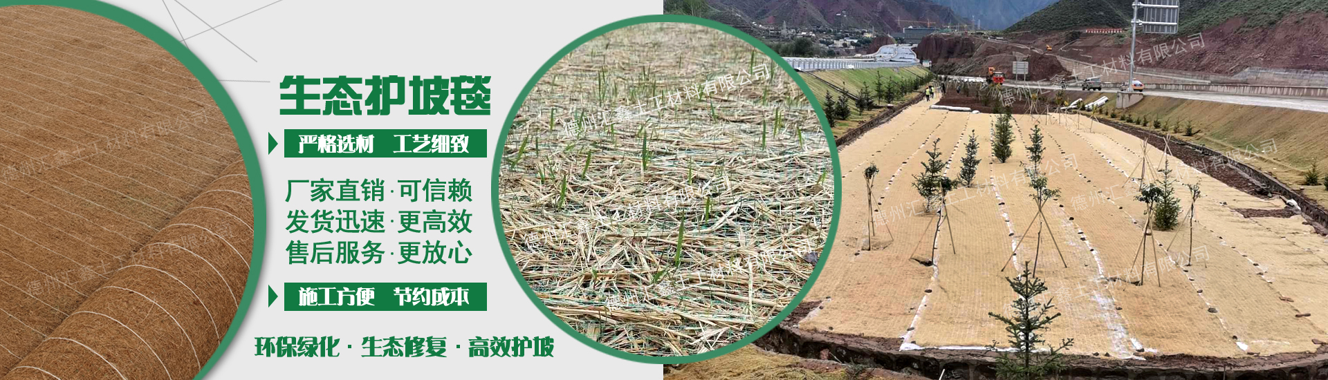 德州匯鑫土工材料有限公司是一家專業(yè)生態(tài)護坡產(chǎn)品、技術(shù)服務(wù)及施工為一體的綜合性企業(yè)。公司主要生產(chǎn)銷售植物纖維毯、植生毯、椰絲毯、抗沖生物毯、生態(tài)毯、秸稈纖維毯、麻椰固土毯、塑筋水保抗沖椰墊、生態(tài)袋、植生袋等各種護坡材料,產(chǎn)品廣泛應(yīng)用于:高速公路邊坡綠化、山體邊坡綠化護坡、河道邊坡、人工湖邊坡防護及其他生態(tài)邊坡治理等工程。經(jīng)廣大工程單位使用證明,產(chǎn)品質(zhì)優(yōu)價廉,施工方便,售后服務(wù)好,得到廣大客戶的一致好評。 "為客戶提供優(yōu)質(zhì)產(chǎn)品及服務(wù)"的宗旨, 熱誠希望攜手各界朋友,共鑄造彼此輝煌。 ...